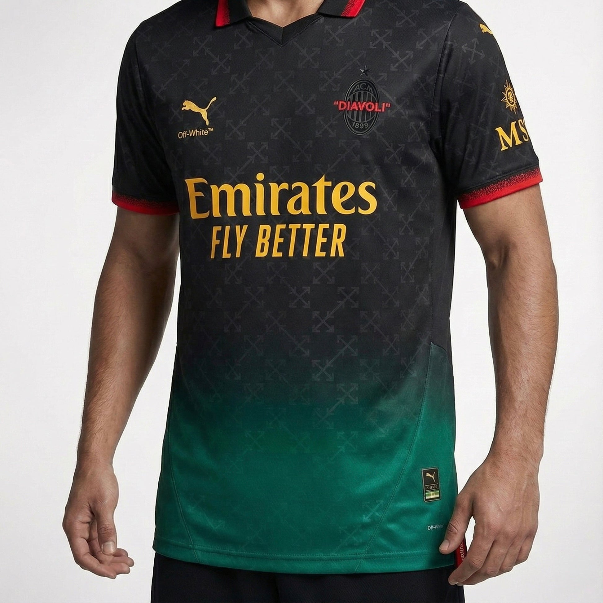 שיתוף הפעולה המדובר בין מילאן למותג האופנה אוף-ווייט מקבל תפנית אפלה, יוקרתית ומסתורית. אם הגרסה האדומה מייצגת את האש, הגרסה השחורה היא הלילה של מילאנו. העיצוב מציג בסיס שחור עמוק עם מעבר צבעים עדין לירוק כהה בתחתית, המעוטר באלמנטים בזהב מלכותי ובכיתוב "דיאבולי" (השדים) באדום בוהק. דוגמת החצים האיקונית של המותג שזורה בבד ומעניקה לחולצה טקסטורה עשירה ומראה של פריט אספנות נדיר.