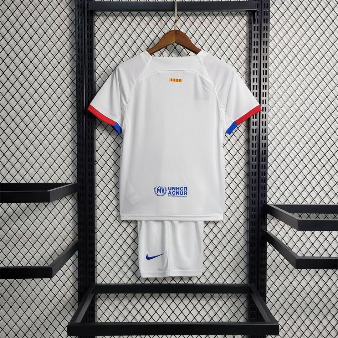 Step onto the pitch with the FCBarcelona 23/24 Away Kids Set. Modern performance fabric meets a classic FCBarcelona identity. Stay cool and dry in every minute.